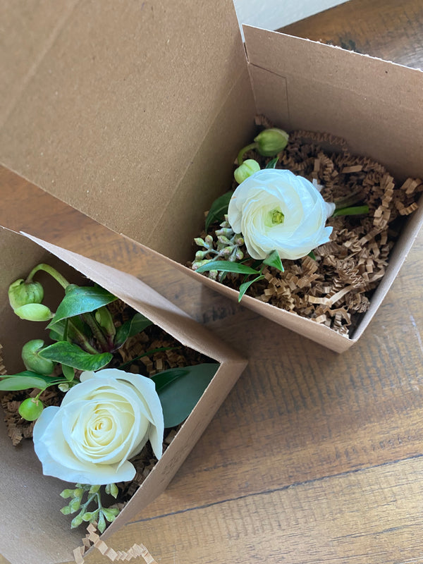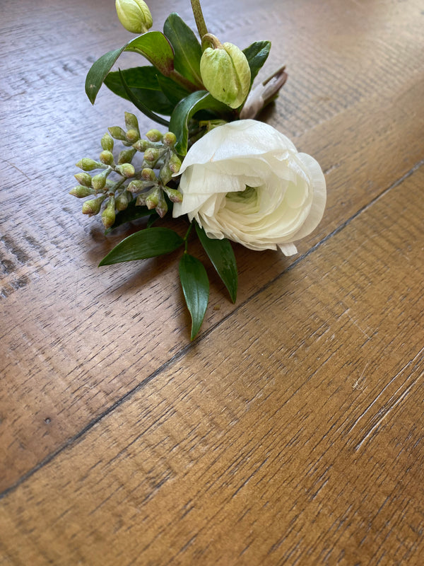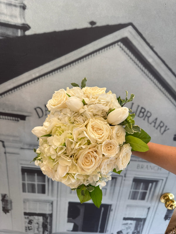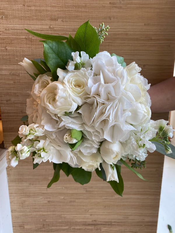 Mix of white flowers - hydrangea, roses, ranunculus and other fresh seasonal flowers finished with a border of greenery and a satin ribbon.